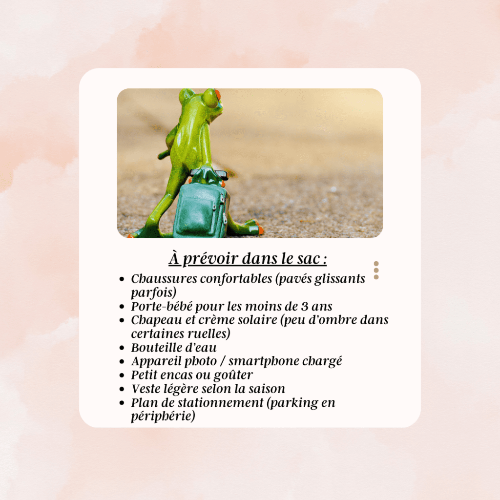 👣 Bébé dans la poussette ? C’est faisable, mais on conseille un porte-bébé si vous avez. Les pavés sont irréguliers et ça secoue un peu.